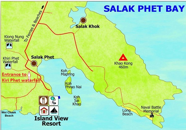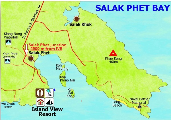 4500 m from IVR at the Salak Phet junction turn right to the temple and the mangrove walkway. Turn left to Salak Khok and the east coast road to the ferries